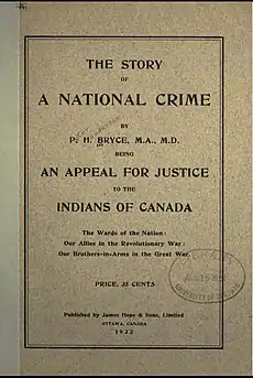 Les conditions sanitaires étaient propices à l'expansion de la tuberculose, ainsi que l'a vivement dénoncé Peter Bryce, alors médecin engagé par le gouvernement fédéral pour superviser 35 pensionnats. Il rapporte notamment que, en 1907, le quart des élèves mourait et que dans une école le taux de mortalité avait atteint 75%. Il intervient à plusieurs reprises auprès du ministère pour obtenir des changements radicaux, mais il se heurte à une fin de non-recevoir de la part de Duncan Campbell Scott. En désespoir de cause, il publie une brochure dénonçant cette situation en 1922[28].