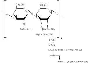 Il est constitué d'une partie glucidique (polysaccharide) et d'une partie peptidique. Le polysaccharide est un polymère de glycosaminopeptide où la N-acétyl-glucosamine (NAG) et l'acide N-acétyl-muramique (NAM) sont liés par des liaisons osidiques . Cette liaison peut être coupée par le lysozyme. Le NAM est un composé spécifique des parois bactériennes. Deux polysaccharides sont liés par des ponts peptidiques au niveau du NAM, formés par différents acides aminés : D-alanine, L-alanine, acide glutamique, L-lysine, acide diaminopimélique (analogue de la lysine). Les acides aminés D sont spécifiques de la paroi bactérienne, on ne les retrouve jamais ailleurs.