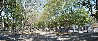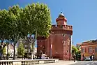 Vue du centre-ville de Perpignan. À gauche, la place de la Résistance, lieu de jonction du boulevard Georges-Clemenceau et du boulevard Wilson. Au centre droit, le Castillet (El Castellet). La rivière la Basse, petit affluent du fleuve côtier la Têt est longée par le quai Sadi-Carnot (à gauche) où se trouvent la préfecture et le conseil départemental, et à droite le quai Vauban et ses commerces.