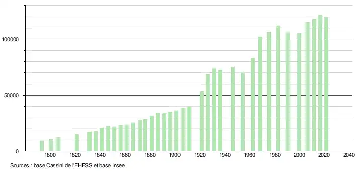 Selon l'Insee, sa population municipale intra-muros était en 2020 de 118 032 habitants. Son aire urbaine concentre 323 388 habitants[1].