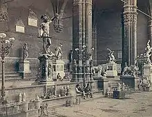 La bâche qui recouvre l’œuvre est enfin retirée le , neuf ans après la commande. Sans cérémonie, Persée apparaît à la foule de curieux juste en face du David, donnant l'impression que la tête de la Méduse a pétrifié l'œuvre de Michel-Ange. L’accueil est triomphal. Même Cosme Ier exprime son contentement à Cellini. Le règlement du travail ranime toutefois l’animosité entre les deux hommes, en raison de négociations mal menées. Cellini ne recevra plus jamais de commandes d’importance.