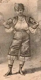 Une « aquarelle d'Eugène Lami »(Archive.org • Wikiwix • Archive.is • Google • Que faire ?) montre une scène de Carnaval[22] et confronte à gauche une femme et sa fille en tenue courante avec à droite une débardeuse montée à l'arrière d'une calèche. Une autre débardeuse est à cheval, de trois quarts dos et porte des vêtements masculins extrêmement moulants. Cette peinture permet de mesurer la distance astronomique séparant le vêtement féminin ordinaire de la tenue de débardeur.
