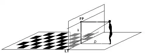 Soit x la longueur du segment parallèle au tableau qui joint la droite parallèle à celle que nous voulons construire passant par le point d'observation et l'axe principal du tableau. x est proportionnel à la distance ; plus on s'éloigne, plus il grandit ; quelle que soit la distance d à l'observateur, le rapport x÷d est constant. La longueur du segment est donc égale à d×a, avec a caractéristique de l'angle que fait la droite que nous construisons à l'axe principal du tableau[alpha 4]. La représentation de la longueur du segment, sur le tableau, sera, comme toujours, longue de x÷dobjet×dtableau. Remplaçant x par dobjet×a, on obtient x=a×dtableau. Il est un cas où le point de fuite est particulièrement facile à construire ; c'est celui où a est égal à 1, c'est-à-dire, quand l'écart de la droite à l'axe du tableau est égal à la distance à l'observateur. C'est l'angle que fait la diagonale d'un dallage carré dont un côté est parallèle au tableau. Ce dallage concret peut aussi servir de construction ; il constitue un repère pour les deux dimensions perpendiculaires au tableau.