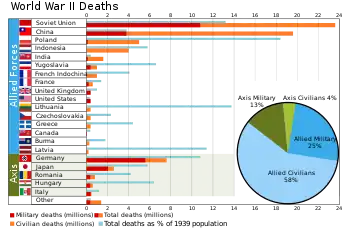 Le tableau suivant présente le nombre de tués pour chaque pays avec sa population d'avant-guerre pour montrer l'impact relatif de ces pertes. Les pertes militaires incluent les morts au combat et les disparus ainsi que les pertes liées aux accidents, aux maladies et aux décès en captivité. Les pertes civiles regroupent les victimes des bombardements stratégiques, de la Shoah, des crimes de guerre japonais, des transferts de population en Union soviétique, des autres crimes de guerre et des morts dues aux famines et aux maladies liées à la guerre. L'estimation du nombre de tués lors d'une guerre est un sujet controversé et les historiens avancent souvent plusieurs estimations différentes sur le nombre de victimes de la Seconde Guerre mondiale[4]. La distinction entre les pertes civiles et militaires causées directement par les combats et les dommages collatéraux n'est pas toujours très claire. Les notes de bas de page donnent une analyse plus détaillée du nombre de victimes et leurs sources.