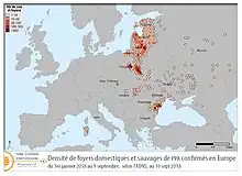 La maladie est originaire d'Afrique, et est arrivée en Géorgie en 2007. La souche retrouvée en Géorgie est considérée comme beaucoup plus virulente que les épidémies connues jusqu'alors[23]. De là, elle s'est répandue en Russie, puis dans les Pays baltes à partir de 2014[24]. En 2016, elle frappe, en plus de la Russie et des Pays baltes, l'Ukraine, la Moldavie, la Biélorussie et la Pologne[25]. À l'été 2017, la maladie arrive en Tchéquie, mais est contenue notamment grâce à de nombreux abattages préventifs de porcs et de sangliers[26]. Le , la Hongrie connaît son premier cas, à proximité de la frontière slovaque[27]. La maladie est détectée pour la première fois en Roumanie en [28], et en , 110 000 porcs y sont abattus préventivement en raison de plusieurs foyers d'épidémie[29]. En Pologne, la maladie progresse vers l'ouest de 3 à 5 kilomètres par mois, et risque d'arriver prochainement en Allemagne[30].