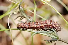 Le cycle larvaire est très court[2]. La chenille possède une tête marron tachée de noir et un corps noir tacheté de blanc et de marron orné d'une paire de lignes dorsales blanches et d'un scoli marron[3].