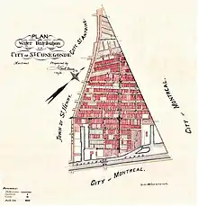 Les limites de la ville de Sainte-Cunégonde sont définies par le canal de Lachine, l’avenue Atwater, le boulevard Dorchester (aujourd’hui René-Lévesque) et une ligne droite tracée entre l’angle de l’avenue Atwater et de la rue Tupper jusqu’au bassin du canal à l’ouest de l’écluse Saint-Gabriel, la limite de la ville de Montréal. Le quartier Saint-Joseph est défini par cette limite, la rue Saint-Antoine, le square Victoria, la rue McGill et la rue Notre-Dame. À cette époque, le chemin de fer Grand Trunk traverse le secteur et termine à la gare Bonaventure, à l’emplacement présent du Planétarium de Montréal[8]. L’ancien hôtel de ville de Sainte-Cunégonde subsiste toujours rue Vinet; il a été converti en bibliothèque et centre communautaire.