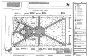 En ce qui concerne l’aménagement des arches, la proposition originale soumise par M. Pellissier et l’Association était de concevoir des Termini (termes) romains et de les installer aux extrémités du quartier afin de délimiter le territoire[13]. L’architecte préconise ce type d’aménagement puisque « cela se voulait une référence directe aux statues placées aux limites des champs et représentant des dieux sylvestres qui agissaient comme protecteurs de la communauté et garantissaient la prospérité des surfaces comprises dans leur empreinte[10]. »