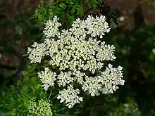 Les fleurs sont petites, blanches, hermaphrodites, groupées en ombelles composées d'une demi-douzaine à une dizaine de petites ombellules. Il n'y a pas de bractées mais chaque ombellule porte 1 à 5 longues bractéoles linéaires, pendantes[2].