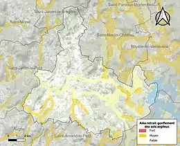 Le retrait-gonflement des sols argileux est susceptible d'engendrer des dommages importants aux bâtiments en cas d’alternance de périodes de sécheresse et de pluie[21]. 9,3 % de la superficie communale est en aléa moyen ou fort (27 % au niveau départemental et 48,5 % au niveau national métropolitain)[Carte 2]. Depuis le , en application de la loi ÉLAN, différentes contraintes s'imposent aux vendeurs, maîtres d'ouvrages ou constructeurs de biens situés dans une zone classée en aléa moyen ou fort[Note 3],[22].