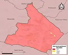 Le retrait-gonflement des sols argileux est susceptible d'engendrer des dommages importants aux bâtiments en cas d’alternance de périodes de sécheresse et de pluie. La totalité de la commune est en aléa moyen ou fort (75,2 % au niveau départemental et 48,5 % au niveau national). Sur les 46 bâtiments dénombrés sur la commune en 2019, 46 sont en aléa moyen ou fort, soit 100 %, à comparer aux 94 % au niveau départemental et 54 % au niveau national. Une cartographie de l'exposition du territoire national au retrait gonflement des sols argileux est disponible sur le site du BRGM[23],[Carte 3].