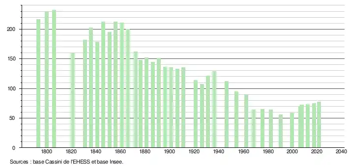 | L'évolution du nombre d'habitants est connue à travers les recensements de la population effectués dans la commune depuis 1793. Pour les communes de moins de 10 000 habitants, une enquête de recensement portant sur toute la population est réalisée tous les cinq ans, les populations légales des années intermédiaires étant quant à elles estimées par interpolation ou extrapolation[27]. Pour la commune, le premier recensement exhaustif entrant dans le cadre du nouveau dispositif a été réalisé en 2007[28]. En 2021, la commune comptait 77 habitants[Note 6], en augmentation de 2,67 % par rapport à 2015 (Aude : +2,47 %, France hors Mayotte : +1,84 %). |