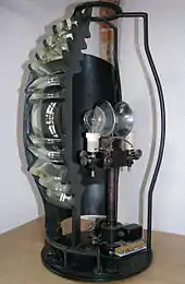 Traditionnellement, on concentre la lumière par un système de lentilles en rotation. Dans les très anciens phares, l'éclairage était assuré par une lampe à pétrole ou à huile (huile de colza, puis huile minérale avec les mèches mises au point par Fresnel) et la rotation par un mécanisme d'horlogerie. Le bâti sur lequel reposait l'optique pouvait reposer sur du mercure afin de réduire la friction. On utilise ensuite l'éclairage au gaz sous pression avec manchon Auer, et enfin l'électricité avec des lampes à arc, puis à incandescence[21]. Les ampoules sont alimentées par un groupe électrogène qui fournit également l'électricité au gardien du phare. Pour les phares en mer, la production d'électricité est assurée par des moteurs thermiques, des panneaux solaires ou des aérogénérateurs, doublés d'un ensemble de batteries d'accumulateurs.