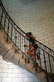 Il contient un escalier à vis de 272 marches. Ces marches en kersanton mesurent 18 centimètres de haut, 80 centimètres de large et sont encastrées de 24 centimètres dans le mur[34]. La paroi autour de l'escalier est ponctuée de renfoncements à chaque fenêtre. Le plafond est recouvert de 22 plaques de marbre bleu turquin posées sur des nervures de rayons de bronze qui convergent vers une rosace de bronze centrale. La rampe, faite de 2,565 tonnes de bronze, comporte un barreau par marche. Le pilastre a une forme qui imite celle du phare d'Eckmühl[33]. Les 272 marches de l'escalier en colimaçon permettent d'atteindre une plateforme (appelée palier de repos) depuis laquelle une série de 13 marches plus raides mènent à la salle d'honneur du campanile. La porte d'accès de cette salle est formée d'un vantail massif en bronze qui vient s'appliquer sur le parement de la tourelle.