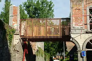 Cette seconde passerelle est posée en : réalisée en bois, elle passe à travers la fenêtre en anse de panier mentionnée plus haut, qui était jadis murée (comme on peut le voir sur une des photos de 2007 plus haut) et a été dégagée pour permettre le passage de la passerelle.