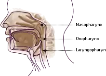 Le pharynx est un conduit musculo-membraneux[1], en forme d'entonnoir ou d'une demi-gouttière. Il relie, en partie supérieure, la bouche et les fosses nasales avec l’œsophage et le larynx, en partie inférieure. Appliqué contre le rachis cervical, il s'étend de la base du crâne au bord inférieur de la 6e vertèbre cervicale (C6) (ou bord supérieur de C7). Il est toujours béant : en permanence 2 cm séparent les parois antérieure et postérieure.
