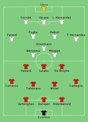 Si la France continue de dominer outrageusement la rencontre, le match se ferme peu à peu, les deux équipes semblant se craindre l'une l'autre. À trois minutes de la fin du temps réglementaire, Lukaku marque un doublé sur un excellent service de Carrasco. Le but est finalement refusé pour une position de hors-jeu. Trois minutes plus tard, Griezmann décale idéalement Pavard qui centre au second poteau. Légèrement excentré, le centre fuit Benzema qui laisse la place à Théo Hernandez. Le défenseur latéral français prend le temps de contrôler le ballon et tire poteau opposé. Courtois est battu et la France prend le score pour son compte tout à la fin du match.