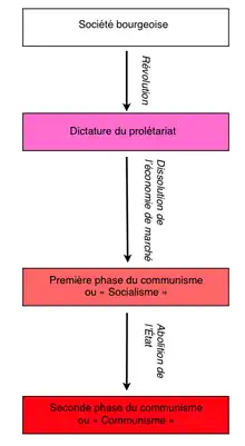 Marx évoquait déjà une distinction entre une « première phase de la société communiste », qui commence avec la révolution communiste, et qui évolue progressivement jusqu'à une « phase supérieure de la société communiste »[7]. Lénine a formalisé et développé cette distinction, en parlant de phase socialiste et de phase communiste.