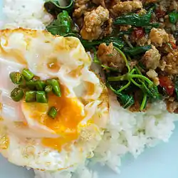 | Ingrédients | basilic sacré thaïlandais, viande ou fruits de mer, ail cultivé, sauce de poisson, sucre et piment oiseau |