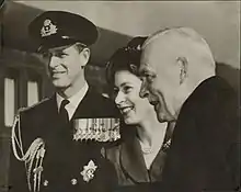 Le , le roi George VI et la reine Elizabeth visitent le Britannia Royal Naval College à Dartmouth. Pendant cette visite, la reine et Lord Mountbatten demandent à Philip d'accompagner les deux filles du couple royal, Élisabeth et Margaret, ses cousines au 8e degré par la reine Victoria, et au 7e par le roi Christian IX[29]. Finalement, au cours de l'été 1946, Philip demande au roi la main de sa fille. Le roi accepte sa demande, mais ne veut fournir aucun engagement formel jusqu'au vingt-et-unième anniversaire d'Élisabeth, au mois d'avril suivant[30]. Dans l'intervalle, Philip renonce à ses titres royaux grec et danois ainsi qu'à son allégeance à la couronne grecque, se convertit de l'orthodoxie grecque à l'anglicanisme et devient sujet britannique par naturalisation[alpha 1], tout ceci étant achevé le . Philip Mountbatten prend le nom de famille de sa mère. Les fiançailles sont annoncées au public le [31]. La veille de son mariage, le roi George VI décerne à Philip le prédicat d'altesse royale et le matin du mariage, le , il est fait duc d'Édimbourg, comte de Merioneth et baron Greenwich[32].