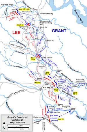 En rejoignant l'Armée du Potomac, la cavalerie de Sheridan remporte une victoire tactique à Haw's Shop (28 mai), mais ses pertes sont lourdes et elle permet à la cavalerie confédérée d'obtenir des renseignements importants sur le dispositif des troupes de l'Union. Elle prend des carrefours routiers stratégiques ce qui déclenche la bataille de Cold Harbor (1er au 12 juin) puis repousse nombre d'assauts avant de recevoir des renforts. Sheridan lance ensuite un raid au nord-ouest pour couper la Virginia Central Railroad et rejoindre l'armée de la vallée de Shenandoah du major-général David Hunter. Mais il est intercepté par la cavalerie confédérée du major-général Wade Hampton et défait lors de la bataille de Trevilian Station, ayant ainsi manqué tous les objectifs de son raid[25].