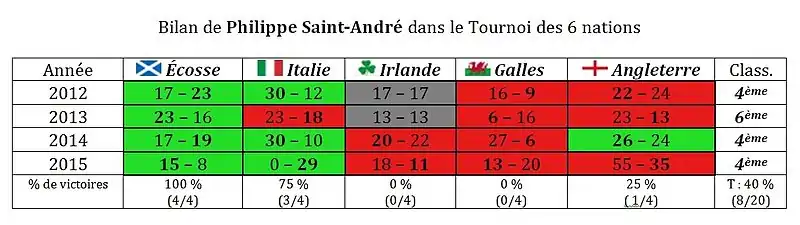 Alors que le scepticisme est de plus en plus présent chez les médias et les supporters[65], Saint-André annonce que le Tournoi 2015 va servir de préparation à la Coupe du monde en septembre[66]. Lors du premier match, le XV de France s'impose face à de vaillants Écossais (15-8)[67], puis est battu par l'Irlande (18-11) à l'Aviva Stadium[68]. Quinze jours plus tard, les Bleus sombrent une nouvelle fois au Stade de France contre le Pays de Galles (13-20)[69]. « PSA », qui n'aura jamais réussi à battre cette équipe durant son mandat[70], voit les critiques s’abattre et réclamant sa démission[71],[72]. Il décide de hausser le ton vis-à-vis de ses joueurs[73]. Le 15 mars, l'équipe de France se rachète en partie en infligeant 29-0 à l'Italie[74]. Enfin, pour le dernier match du tournoi de l'ère Saint-André[75], la France et l'Angleterre se livrent une rencontre sensationnelle à Twickenham où le XV de la Rose l'emporte (55-35), avec 12 essais inscrits, malgré un « French Flair[Note 6] » retrouvé[76]. De nouveau classé quatrième, Saint-André est le premier sélectionneur à ne pas remporter le Tournoi ni à figurer une seule fois sur le podium[77]. À six mois du Mondial, les Bleus inquiètent mais le sélectionneur promet une préparation « commando »[78],[79].