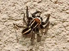 Comme toutes les araignées sauteuses, elle possède huit yeux simples dont les yeux médians antérieurs sont plus grands, tandis que les ocelles de côté sont plus petits et possèdent une excellente vue permettant à l'araignée de bien localiser sa proie avant de se jeter sur elle.
