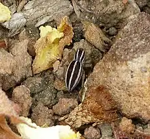 Le tégument de ses individus est recouvert d'une dense pilosité dotés de squamules. Le prosome et l'opisthosome sont de forme allongée chez le mâle, son céphalothorax étant plus bombé et massif que l'opisthosome. Son corps est de couleur brun foncé ou brun grisé avec deux larges bandes longitudinales blanches, des yeux jusqu'au bout du céphalothorax, tandis que l'opisthosome est recouvert d'une bande blanche médiane et de deux bandes latérales blanches.