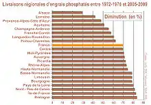 En France, selon le bilan[19] publié en 2009 sur les phosphates dans les sols de la France métropolitaine, en 2001, 775 000 tonnes ont été apportées aux sols français sous forme d'engrais minéraux. Six ans plus tard (en 2007) sur 2 372 points de mesure, près de la moitié des sols analysés en France posent encore problème : 2 % sont de qualité mauvaise, 4 % médiocre, 12 % moyenne, 55 % bonne et 27 % très bonne.