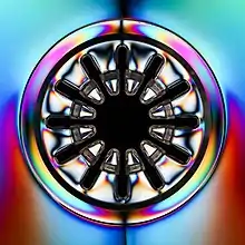 Photoélasticité du centre d'un boitier de CD-Rom.
