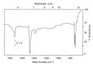 Dans l'exemple présenté ici, les groupes carbonyle ont été facilement détectés par spectroscopie infrarouge à partir d'un film mince. Le produit était un cône de signalisation fabriqué par rotomoulage en LDPE, qui s'était fissuré prématurément en service. De nombreux cônes similaires ont également échoué parce qu'un additif anti-UV n'avait pas été utilisé pendant leur fabrication.