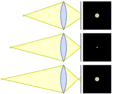 La lumière émise par l'objet photographié sera focalisée quelque part par l'objectif, c'est-à-dire que toute la lumière émise par un point donné de l'objet se rassemblera sur un même point de l'image, son point conjugué, dont la distance à l'objectif est donnée par la relation de conjugaison. C'est donc à cette distance de focalisation que la surface sensible doit être placée : si elle est située plus près ou plus loin, les rayons lumineux issu du même point de l'objet ne seront plus focalisés, et seront enregistrés sous la forme d'une tache, d'autant plus large que l'on s'éloigne du point focal.