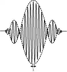 - où (constante de Dirac ou constante de Planck réduite), est le vecteur d’onde du photon, d’amplitude et dirigé selon la direction de propagation du photon, et est sa fréquence angulaire. Comme pour les autres particules, un photon peut se trouver dans un état dont l’énergie n’est pas bien définie, comme dans le cas d’un paquet d’onde. Dans ce cas, l’état du photon est décomposable en une superposition d’ondes monochromatiques de longueurs d’onde voisines (via une transformation de Fourier).