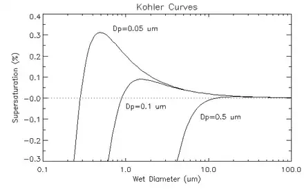 Selon les calculs de Köhler, qui s'est servi de la loi de Raoult et de l'effet Gibbs-Thomson, on peut en tirer l'équation suivante qui relie le diamètre () de la gouttelette à la pression de vapeur d'eau (), la pression de saturation au-dessus d’une surface plane (), la tension de surface entre l'eau liquide et la vapeur d'eau (), la masse volumique de l'eau pure (), le nombre de moles de soluté () et la masse molaire de l'eau ()[9] :