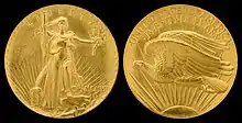 En 1905, le président Theodore Roosevelt demande à son ami Augustus Saint-Gaudens d'améliorer les motifs des pièces de monnaie américaines. Saint-Gaudens accepte cette tâche pour la somme de 5 000 dollars et décide de s'inspirer des motifs de la Grèce antique dans son travail[25]. L'avers du projet représente la personnification de la Liberté, marchant avec un pied appuyé sur une pierre. Elle tient une branche d'olivier dans sa main gauche et une torche dans la droite. Derrière la figure, des rayons et le bâtiment du Capitole sont visibles. Le long du bord, des étoiles à six branches, au-dessus est inscrit le mot « LIBERTY ». L'année d'émission, en chiffres romains, est placée en bas, à droite. Le revers de cette variante présente un aigle volant vers la gauche, emprunté par Saint-Gaudens au cent Flying Eagle. En arrière-plan derrière l'aigle, des rayons et le soleil sont visibles. Au-dessus de l'aigle, le long du bord, le nom du pays « UNITED-STATES-OF-AMERICA », et en dessous, le montant avec le nom de la devise « TWENTY DOLLARS »[26]. Pendant la frappe de cette variante, des travaux sont entrepris pour améliorer son image. De 1907 à 1908, une pièce à bas-relief est frappée, avec l'année inscrite en chiffres arabes et sans la devise « In God We Trust », ce qui ne plaît pas au président[27]. En 1908, l'image de la pièce est modifiée une fois de plus. La devise « In God We Trust » est ajoutée, se trouvant au-dessus du contour du soleil. Les rayons du soleil sont également améliorés[28].