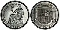 23.30 | 5,00 g | argent | la valeur faciale UNA PESETA sous le blason espagnol | 1933 | ||
