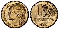 23.20 | 5,00 g | laiton | un visage de femme à gauche entourée de la mention REPUBLICA ESPAÑOLA | la valeur faciale UNA PESETA à côté d'une grappe de raisin et le millésime | 1937 | |