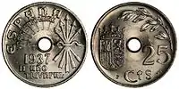 25.00 | 7,00 g | cupronickel | un faisceau de 5 flêches devant un soleil avec les mentions Il año triunfal, Una, Grande y Libre et ESPAÑA | la valeur faciale 25 CTS avec les armoiries de l'Espagne franquiste | 1937 | |