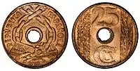 25.20 | 7,00 g | nickel | une allégorie de la république avec la mention REPUBLICA ESPAÑOLA et le millésime | la valeur faciale 25 CENTIMOS, une roue dentée et des épis de blé | 1934 | |