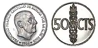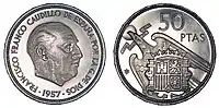 30.30 | 12,50 g | la valeur faciale 50 PTAS à côté des grandes armoiries de l'Espagne franquiste sur un aigle | ||||