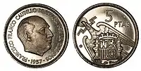 23.00 | 5,70 g | cupronickel | la valeur faciale 5 PTAS à côté des grandes armoiries de l'Espagne franquiste sur un aigle | 1957 | |||