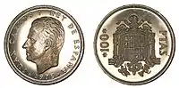 21.00 | 1,20 g | Aluminium | portrait du roi Juan Carlos à gauche avec la mention JUAN CARLOS, REY DE ESPAÑA et le millésime | la valeur faciale 1 PTA à gauche des armoiries de l'Espagne | ||