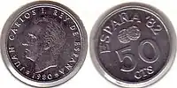 1,00 g | aluminium | (première) portrait du roi Juan Carlos à gauche avec la mention JUAN CARLOS, REY DE ESPAÑA et le millésime | la valeur faciale 50 CTS devant un globe terrestre et un ballon | 1980 | ||