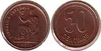 23.40 | 6,00 g | cuivre | une allégorie de la république assise, avec la mention REPUBLICA ESPAÑOLA et le millésime | la valeur faciale 50 CENTIMOS | 1937 | |