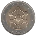 La représentation de l'Atomium, à Bruxelles. La lettre B, initiale de la Belgique apparaît en haut de la pièce et le millésime 2006 apparaît en bas. L'anneau externe de la pièce comporte les douze étoiles du drapeau européen. | ||||||