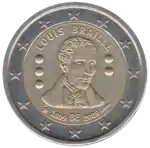 Le portrait de Louis Braille, entre ses initiales L et B écrites dans l'alphabet dont il est l'auteur. Au-dessus du portrait, son nom LOUIS BRAILLE ; sous le portrait, l'indication BE du pays émetteur, entre les dates 1809 et 2009. L'anneau externe de la pièce comporte les douze étoiles du drapeau européen. | ||||||