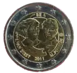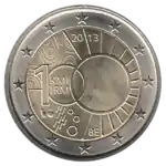 Tous les pays de la zone euro ont émis le 1er janvier une pièce commémorative de 2 € pour célébrer le 10e anniversaire de l'Union économique et monétaire. Le centre de la pièce illustre une silhouette humaine stylisée dont le bras gauche est prolongé par le symbole de l'euro. Le nom du pays émetteur en néerlandais, français et allemand BELGIE–BELGIQUE–BELGIEN apparaît dans la partie supérieure, tandis que l'indication 1999-2009 et l'acronyme EMU (pour Economic and Monetary Union, Union économique et monétaire ou UEM) apparaissent dans la partie inférieure. L'anneau externe de la pièce représente les douze étoiles du drapeau européen. | ||||||