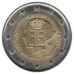 Le logo du Concours Reine Élisabeth, composé d'un double E couronné, est superposé à l'effigie de la Reine Élisabeth, tournée vers la gauche. Au-dessus de l'effigie sont indiquées les années 1937-2012. En dessous de l'effigie figure l'inscription QUEEN ELISABETH COMPETITION (Concours Reine Élisabeth). L'indication du pays émetteur BE (pour Belgique) se trouve à droite de l'effigie. L'anneau externe de la pièce comporte les douze étoiles du drapeau européen. | ||||||