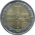 Une croix, dans laquelle on peut lire, sur l'axe horizontal CROIX ROUGE, sur l'axe vertical, RODE KRUIS (Croix-Rouge) et au centre 150. En bas à gauche, le nom du pays émetteur en abrégé BE. En bas à droite, le millésime 2014. L'anneau externe de la pièce comporte les douze étoiles du drapeau européen. | ||||||
