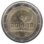Le logo officiel des commémorations du centenaire de la Première Guerre mondiale en Belgique, composé des dates 2014-18 dont la texture du 20 est différente du reste, surmontées d'un coquelicot stylisé et surmontant le texte anglais The Great War Centenary (Le centenaire de la grande Guerre). La mention trilingue du pays émetteur est indiquée en haut à gauche BELGIE-BELGIQUE-BELGIEN. L'anneau externe de la pièce comporte les douze étoiles du drapeau européen. | ||||||